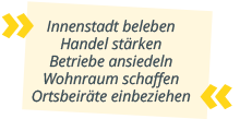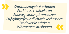 Wohnen: Bezahlbares und gutes Wohnen für alle Lebensformen ist Lebensqualität. In der Innenstadt fehlt es an gutem Wohnraum. Es fehlt an Mut, Entschlossenheit und einem langfristigen Plan. Ich setze mich dafür ein, mit der stadteigenen Projektentwicklungsgesellschaft und heimischen Eigentümern guten Wohnraum für Senioren, Alleinstehende, Alleinerziehende und Familien zu entwickeln: