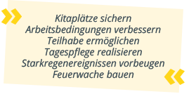 Kinder, Senioren und Familien: Eschwege hat viele gute Kindertagesstätten – und jedes Kind muss seinen Platz bekommen. Ich setze mich für baulich gut ausgestattete Kindergärten und Krippen, gute Arbeits- und Ausbildungsbedingungen und für zufriedenes Personal ein. Hierfür werde ich einen regelmäßigen Austausch mit den Erzieherinnen und Erziehern etablieren. Das Engagement der Stadt zur Prävention der Folgen von Kinderarmut werde ich fortführen. Um pflegende Angehörige zu entlasten, setze ich mich für die Realisierung der